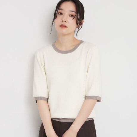 衿ぐりと袖口と裾を配色で切り替えた、クリーンな5分袖ニット。