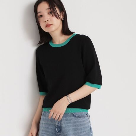 衿ぐりと袖口と裾を配色で切り替えた、クリーンな5分袖ニット。