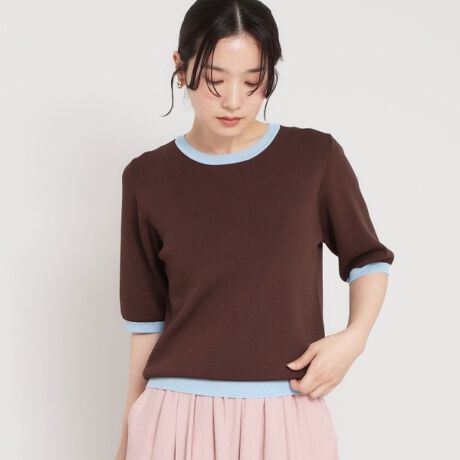 衿ぐりと袖口と裾を配色で切り替えた、クリーンな5分袖ニット。