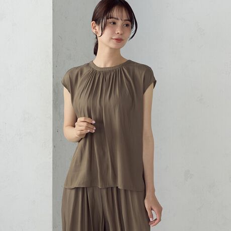 ネックの前後に施したギャザーがフェミニンで華やかな雰囲気です。