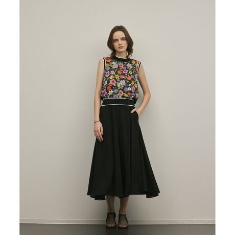 コーディネートの主役にぴったりな、品よく着映えるフラワープリントニットトップス。レーヨンブレンドのさらりとしたニット生地とフラワープリントをのせたツイル生地を前見頃に切り替え、異素材でコントラストをつけた一枚。襟ぐりや袖回りなどにバイカラーラインでアクセントをプラスし、メリハリをつけて甘すぎない大人な表情に仕上げました。繊細なタッチの美しい柄感や春らしい華やかなカラーパレットが、暖かな日差しによく似合います。お揃いでお作りしたカーディガンやスカーフとの組み合わせもぜひお楽しみください。
