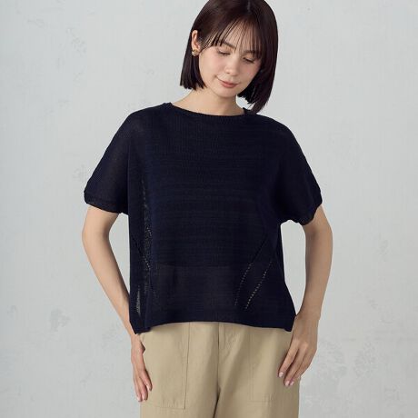 夏場でも快適な和紙素材で一枚で決まるサマーニットです。