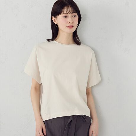 柔らかな印象のラウンドヘムは、裾をアウトしても軽やかな着こなしに。