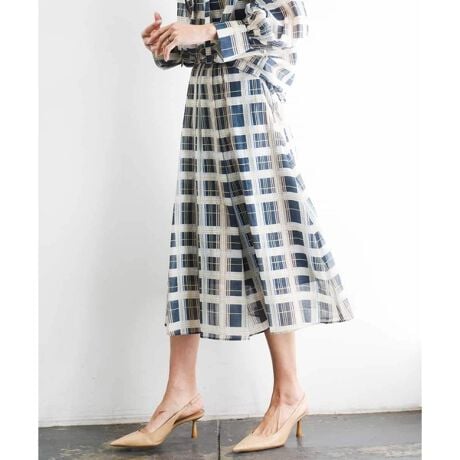 素材のほどよいハリ感とシアー感を活かした、軽やかな表情のスカート。分量感のあるシルエットながら重く見えず、動きに合わせて生まれる柔らかな揺れ感が魅力です。ネイビーベースのチェック柄が甘さを抑え、落ち着いた大人の雰囲気を演出。きれいめからカジュアルまで、幅広いコーディネートに活躍します 40サイズは限定店舗展開です。
