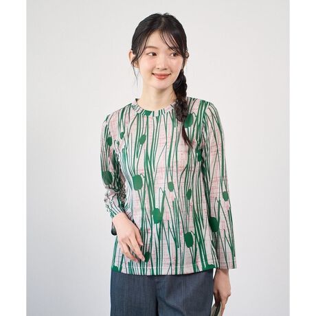 プリント柄の魅力を引き立てる、シンプルなインナーカットソーに仕上げました。2本針のステッチを配色にすることで、プリントの個性にほどよいアクセントをプラスしています。軽やかなチュール素材を使用しているため、重ね着してももたつかず、これからの季節のインナーとしても心地よく着ていただけます。