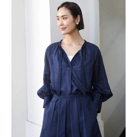 ほどよいハリ感とシアー感のある素材が、軽やかで立体感のあるシルエットを演出。ボリュームスリーブと風通しの良いデザインが、シーズンムードを高めてくれる一枚です。襟元のリボンはあえて結ばずラフに垂らすことで、今っぽい抜け感のある着こなしに。明るめのネイビーが 甘さを抑えつつ、上品で女性らしい印象に仕上げます。