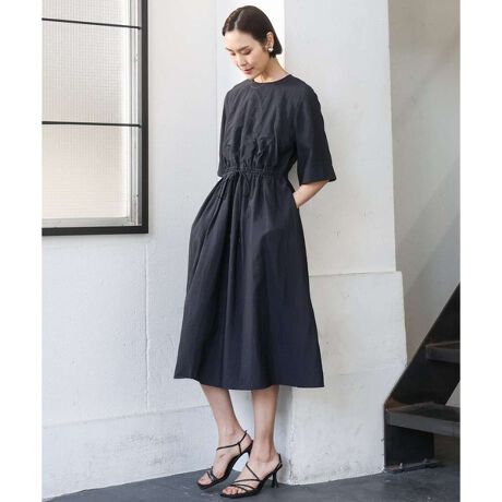 ウエストギャザーとドローストリングでシルエットを自由に調整できるので、一枚でさっと着こなすだけでもサマになります。ジャケットやカーディガンを合わせたレイヤードスタイルも楽しめ、季節やシーンに応じて着回し可能。広めの袖口や五分袖のデザインが軽やかさをプラスし、靴や小物次第で、きれいめにもカジュアルにも対応する万能ワンピースです。日常からお出かけまで、幅広いシーンで活躍する一着。