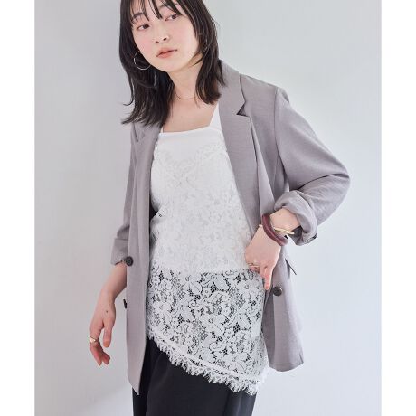 トレンドのレースで作ったアシンメトリーシルエットのキャミ。大人っぽい印象に見えるレースに別付けでつけたスカラップレースで華やかな1着に仕上げました。ストラップは丸紐にし抜け感が出るようにようにし、Tシャツやシャツなどのカジュアルアイテムに馴染むようなデザインになっています。