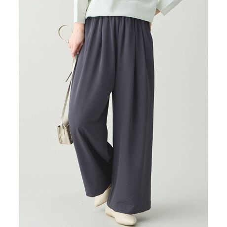 ・タックギャザーを施したリラックス感のあるイージーパンツ・体のラインを拾いにくいゆったりとしたシルエット・ウエストを外側に折り返すことで着丈バランスの変更が可能