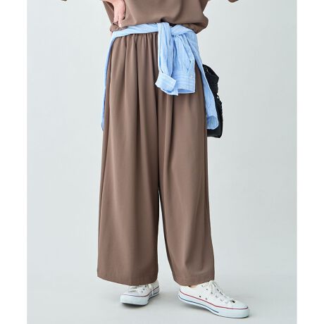 ・タックギャザーを施したリラックス感のあるイージーパンツ・体のラインを拾いにくいゆったりとしたシルエット・ウエストを外側に折り返すことで着丈バランスの変更が可能