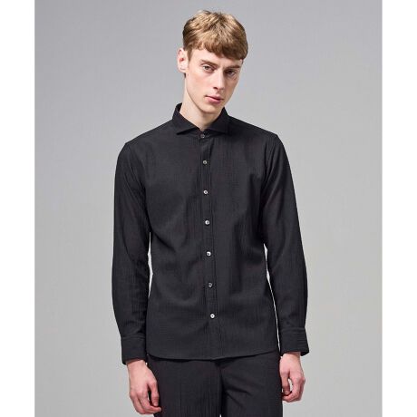 シンプルながら、独特の素材感で個性があり、ノータイでのジャケットインも様になり幅広く対応します。