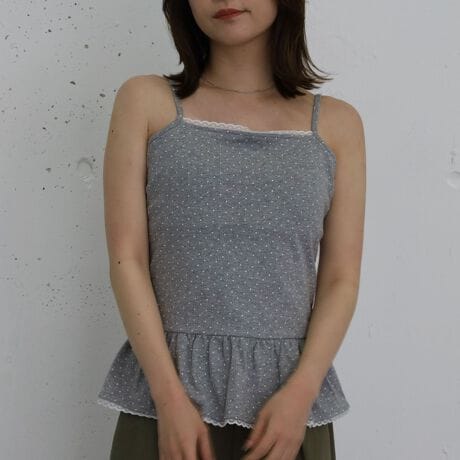 ■1枚で可愛く決まる、カップ付きドットフリルキャミソール■