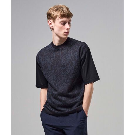 オリエンタルジャガードニットブロック クルーネック半袖カットソー