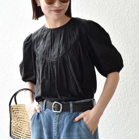 ギャザーをたっぷりと施したクルーネックブラウス。