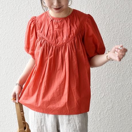 ギャザーをたっぷりと施したクルーネックブラウス。