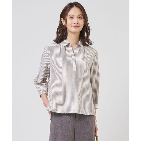 ■デザイン首元に自然な抜け感をつくる、スキッパーデザインのブラウス。フロントはドロスト仕様で、絞りを調節することでシルエットを自由にアレンジできます。袖は軽やかに見える7分袖で、袖口の内側にゴムを施すことで自然なふくらみをキープ。ナチュラルな素材感でありながら、女性らしくフェミニンな印象を与えます。爽やかなストライプ柄で、春夏の装いに涼しげで軽やかさをプラスしてくれる、頼れるアイテムです。カラーは、やわらかい印象を与えるブラウンストライプ(#130)、爽やかで上品な印象のブルーマルチ(#170)の2色展開です。