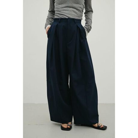 モデル身長166cm(Mサイズ着用)大きめに入れたボックスタックとパネルラインで作る立体的なフォルムがポイントのワイドパンツ。ローウエスト仕様で、抜け感のあるバランスに仕上げた一枚。ベルトループ付きのため、ウエスト位置を上げた着用も可能で、スタイリングに合わせたアレンジが楽しめます。軽量なポリエステル素材を使用しているので、モードなボリューム感をキープしつつも軽い履き心地を叶えます。ハーフ裏付き(IVOY)。透け感ややあり(IVOY)、ストレッチなし。【お手入れ方法】マシンウォッシュ可