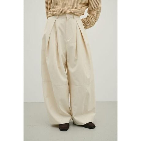 モデル身長166cm(Mサイズ着用)大きめに入れたボックスタックとパネルラインで作る立体的なフォルムがポイントのワイドパンツ。ローウエスト仕様で、抜け感のあるバランスに仕上げた一枚。ベルトループ付きのため、ウエスト位置を上げた着用も可能で、スタイリングに合わせたアレンジが楽しめます。軽量なポリエステル素材を使用しているので、モードなボリューム感をキープしつつも軽い履き心地を叶えます。ハーフ裏付き(IVOY)。透け感ややあり(IVOY)、ストレッチなし。【お手入れ方法】マシンウォッシュ可