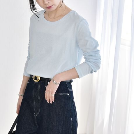 形はベーシックなクルーネックに、袖はあえて長めに設定することでくしゅっとした可愛い手元を演出。