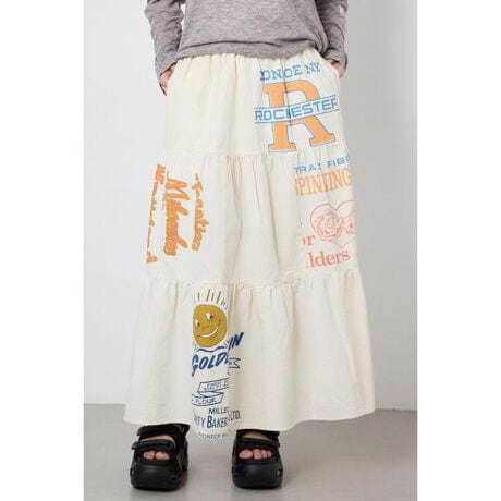 ■ポイントリメイクライクデザインのシリーズのスカート。ボリュームのあるティアードスカートに、遊び心のあるディテールをふんだんに落とし込んだ一着。スタイリングのポイントに、存在感のあるスカートです。■ディテールvintageのエコバッグをリメイクしたようなデザインがポイントでボリューム感がたまらなく可愛いです。ウエスト周りは平ゴム仕様で、リラックスした穿き心地。各パーツにプリントを施し、表情豊かに仕上げました。■スタイリングスカートのデザインを活かし、無地トップスとの合わせがおすすめ。ワンショルダースウェットなど抜け感のあるアイテムや、ミニマムなサイズ感のトップスを合わせることで、メリハリのあるスタイリングが完成します。■生地21/-ツイル×21/-スラブツイルを使用し、異なる表面感の素材を切り替えたパッチワークデザイン。製品BIO WASH加工を施しています。■透け感:なし■裏 地:なし■伸縮性:なし■光沢感:なし[注意事項]※画像の商品はサンプルです。実際の商品と仕様、加工が若干異なる場合があります。※画像の商品は光の照射や角度、お使いのモニター環境により、実物と色味が異なる場合がございます。※着用、お取り扱いの際は、アテンションタグをご確認ください。