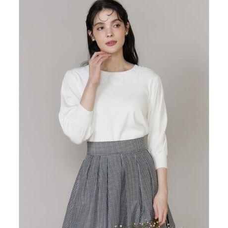 ■デザインフラワーのモチーフレースを贅沢にあしらったニットプルオーバーです。ギャザーをたっぷりと寄せふわっと膨らませた袖はニュアンス感のあるフォルムが今年らしく、着るだけでフェミニンムードを盛り上げてくれる1枚。チクチクしない柔らかな風合いの素材で、短すぎず長すぎない絶妙な着丈なのでスカートはもちろんパンツ等幅広いボトムスとも好相性です。■素材シルクの様な光沢があり見た目や肌触りが良くテロンとした落ち感のある素材のレーヨンと、しわになりにくく強度のあるポリエステルと混紡した素材です。吸水速乾性に優れた素材で、きれいな編み目が清涼感のある印象に。ストレッチ性もあり、長い期間快適に着用していただけます。・バックボタンあり■サンプル撮影商品画像の商品はサンプルです。実際の商品とはサイズや色味、素材、デザイン等の仕様が若干変更になる場合がございます。■カラーについては、可能な限り実際の商品に近いカラーにて撮影をおこなっておりますが、照明の関係により実際の製品とは色味が違って見える場合があります。またパソコン・スマートフォンなどの環境により、若干製品と画像のカラーが異なる場合もございます。現物と画像のカラー差異については返品理由となりませんので、予めご了承ください。■サイズ表記はあくまで目安となります。