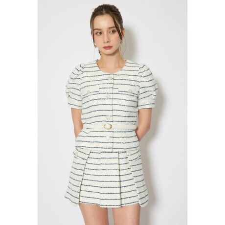 【ノーカラーでスタイリッシュな雰囲気にペプラム風で可愛く着用できるコンパクトジャケット】■ポイントriendaオリジナルツイード生地で製作した春のツイードシリーズ。素材を2種類採用し、その中で3型のデザインを展開しています。1つはこちらのコンパクトジャケット。ノーカラーでスッキリした襟周りに対して、フロントには煌びやかなビジューボタンを施し華やかな印象に仕上げました。■ディテールウエスト位置を高く設定し、共ベルトを付けることでペプラム風に着用できるのがデザインポイントです。ジャケットの部類ですが、コンパクトなサイズ感のためスタイリングによってはトップス風にも着用できます。■スタイリング110JS931-0741・サイドラップツイードSS-PTと同じ生地で製作しているのでセットアップで着用すると今時なワンホンコーデが叶います。また襟やリボンがある布帛のブラウスを合わせるときは、その襟やリボンをノーカラーの部分に出すと華やかなスタイリングに決まっておすすめです。■生地透け感:なし裏 地:あり伸縮性:なし光沢感:なし厚 さ:あり■商品のお気に入り登録お気に入りアイテムの再入荷・在庫1点などの通知を受け取ることができます。[注意事項]※画像の商品はサンプルです。実際の商品と仕様、加工が若干異なる場合があります。※画像の商品は光の照射や角度、お使いのモニター環境により、実物と色味が異なる場合がございます。※着用、お取り扱いの際は、アテンションタグをご確認ください。
