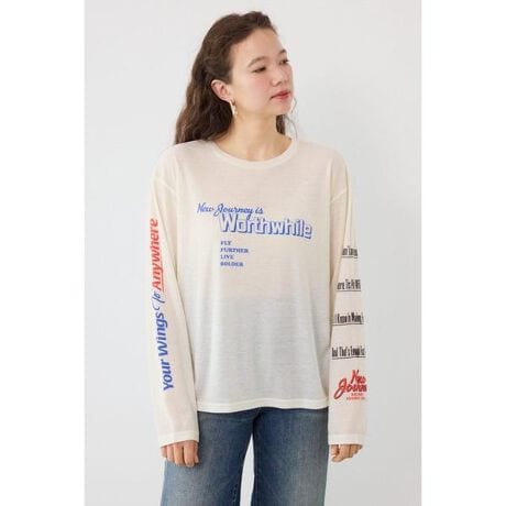 ■ポイント透け感のあるシアー天竺素材のロンTです。ベーシックなボディーカラー展開でスタイリングに取り入れやすいアイテムです。■ディテール袖、フロントに配色がかわいいメッセージプリント入り。キャミソールの上にトップスとして着るのはもちろん、Tシャツとレイヤードして袖のプリントをのぞかせる着こなしもおすすめです。■スタイリング半袖の裏毛トップスやTシャツとレイヤードするのがおすすめです。■生地透け感のあるシアー天竺を使用。柔らかく、軽やかな着心地が特徴です。■透け感:あり■裏 地:なし■伸縮性:ややあり■光沢感:なし※お取り扱い上のご注意プリント箇所は着用・洗濯によリ白化、剥離する場合があります。プリント箇所は湿った状態で重ねて放置すると色移りの原因となりますので注意してください。[注意事項]※画像の商品はサンプルです。実際の商品と仕様、加工が若干異なる場合があります。※画像の商品は光の照射や角度、お使いのモニター環境により、実物と色味が異なる場合がございます。※着用、お取り扱いの際は、アテンションタグをご確認ください。