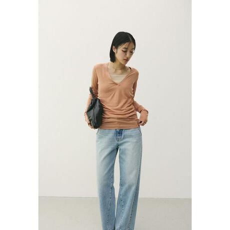 BLK:モデル身長163cm(FREEサイズ着用)L/ORG,GRY:モデル身長166cm(FREEサイズ着用)ウエストに施したドレープがポイントのVネックニット。深めに開けたVネックがスタイリングに抜け感をプラスし、お好みのインナーとレイヤードを楽しめる一枚。コンパクトなサイズ感なので、ジャケットのインナーとしても着用いただけます。リネン混糸を使用したさらりとした肌触りと、軽やかなシアー感が快適な着心地を叶えます。透け感あり、ストレッチあり。【お手入れ方法】手洗い可