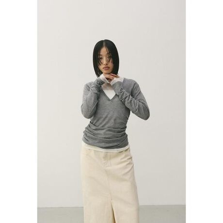 BLK:モデル身長163cm(FREEサイズ着用)L/ORG,GRY:モデル身長166cm(FREEサイズ着用)ウエストに施したドレープがポイントのVネックニット。深めに開けたVネックがスタイリングに抜け感をプラスし、お好みのインナーとレイヤードを楽しめる一枚。コンパクトなサイズ感なので、ジャケットのインナーとしても着用いただけます。リネン混糸を使用したさらりとした肌触りと、軽やかなシアー感が快適な着心地を叶えます。透け感あり、ストレッチあり。【お手入れ方法】手洗い可