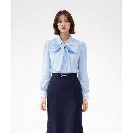 【トレンドのレースディティールをとりいれたフェミニンカジュアルなシャツブラウス】【Point】・存在感のある大きめのリボンで顔まわりを華やかに演出。・袖口にはレースをあしらい、トレンド感のあるシャツに仕上げました。・デイリーからお出かけ、オフィスシーンまで幅広く活躍する、大人フェミニンなシャツです。・軽さのあるシャツ素材でロングシーズン着回せます。ケア方法:ドライクリーニング透け感:なし裏地:なし伸縮性:なし光沢感:なし生地の厚さ:薄手