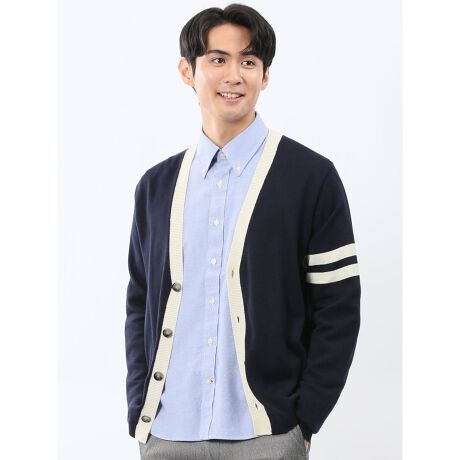 快適な着心地と綺麗目なルックスを兼備した、Vネックのニットカーディガンです。前立てと左袖に配色ラインを入れた、レタード・カーディガン風のデザイン。木目調の大き目なボタンがアクセントになっています。ライトアウターとして、プライベートやオフィスカジュアルにオンオフ兼用で大活躍してくれます。