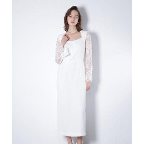 すっきりとした上品なシルエットを叶える二重織素材と、繊細なラッセルレースを組み合わせたコンビドレス。顔まわりを華やかに彩る襟ぐりのカッティングと、凛とした印象を与えるショルダーディテールが、洗練された佇まいを演出します。袖と後ろ身頃には、花柄模様が浮かび上がるラッセルレースをあしらい、さりげない透け感とともに女性らしいやわらかさをプラス。上品さと華やぎを兼ね備えた一着に仕上げました。