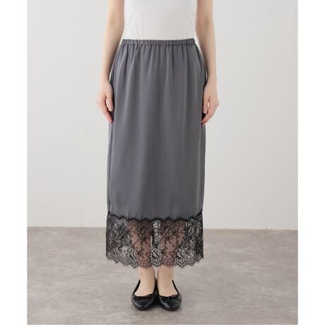 裾にあしらった繊細なリバーレースが、スタイリングにさりげない華やかさを添えるサテンスカート。