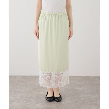 裾にあしらった繊細なリバーレースが、スタイリングにさりげない華やかさを添えるサテンスカート。