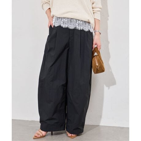 切り替えで立体感を出した、コクーンシルエットのパンツ。細かいしわのような表情のあるナイロン素材を使用。さりげないデザイン性があり、使いやすくも着映えします。後ゴム仕様で楽に穿ける、今すぐ取り入れて夏まで活躍する1本です。