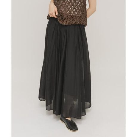 シアー感と程よくハリのある素材がポイントのフレアスカート。少しボリュームがありつつも、タック仕様になっており腰回りはすっきりと仕上げました。膝あたりまで裏地が付いているので透ける心配はなく、足元の透け感は軽やかな雰囲気にしてくれます。
