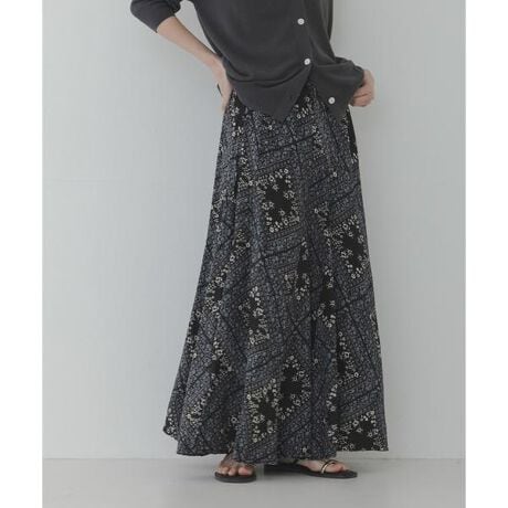繊細なボタニカルモチーフのパネル柄プリントを、シックで落ち着いたブラックと鮮やかで目を惹くブルーのカラーリングでまとめたスカート。