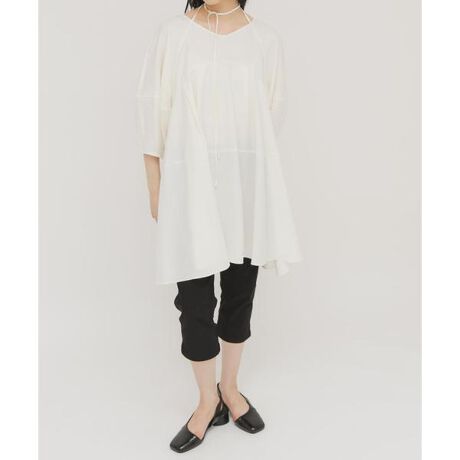 ネックに付いたリボンがアレンジ可能な1着。甘くなりがちなミニワンピースですが、二の腕カバーが期待できる袖のフォルムや、チョーカーデザインで少しモードな印象に仕上げました。程よい透け感なので、合わせるボトム次第でロングスパン活躍します。