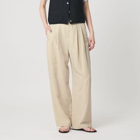上品な麻ブレンド素材でお作りしたワイドパンツ。