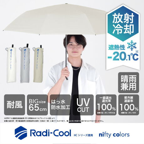 【日陰の様な涼しさ】直射日光下でも、水やエネルギーを消費することなく、外気温より冷却できる「Radi-Cool」を使用。「放射冷却(熱を逃す力)」の温度上昇を抑える力と「遮熱率60%以上」で日傘表面から受ける熱の上昇を抑えます。 【温度上昇を抑える】実際に「Radi-Cool」の日傘を使用した時と使用していない時では照射30分後の頭部表面の温度上昇-37.1℃となり、その違いがサーモグラフィの画像で確認できます。(OFF WHITE傘と傘無しの比較) 【安心の一級遮光】遮光率100%、紫外線遮蔽率100%の「一級遮光」で眩しい日差しや紫外線を遮ります。 【近赤外線100%カット】肌の深部にダメージを与えるといわれる近赤外線も100%カットします。 【雨の日も使える晴雨兼用日傘】耐水圧18,000mm以上のはっ水・防水機能付きで、雨の日も安心です。 【風に強い耐風傘】親骨に太く丈夫なグラスファイバーを使用し、風を受け流す構造になっています。(風速12m/sの検査済み) 【安全ろくろ】指や爪を挟みにくい「安全ろくろ(ストッパー)」仕様で、ボタン操作もスムーズです。 ※記載の紫外線遮蔽率(UVカット率)・UPF値・近赤外線遮蔽率・遮光率・遮熱率・耐水圧の値は、生地単体での測定値です。傘本体の性能を保証する数値ではありません、縫製部分などのUV加工が施されていない箇所も同様です。