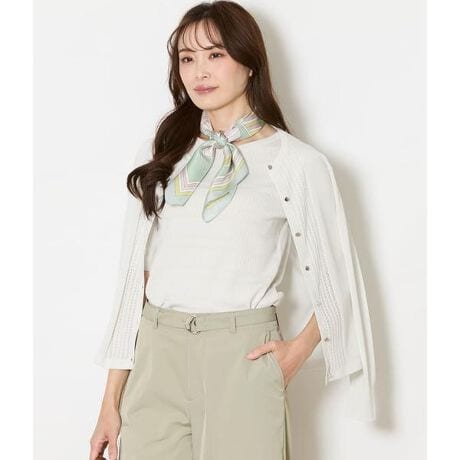 上品な光沢感と滑らかな肌触りが特徴のテンセルポリエステル糸を使用。程よい厚みと伸縮性があり、ロングシーズン快適に着用できる素材感です。