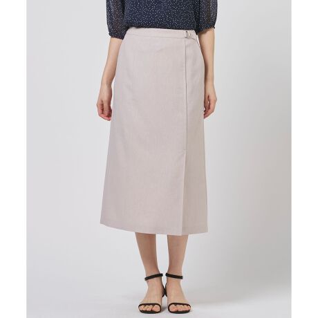 ■デザインアシンメトリーな巻き風デザインに、ウエストのメタルパーツがアポイントのAラインスカート。広がりすぎない優美なシルエットと、膝が隠れる丈感が、大人の女性らしい上品さと落ち着きを演出します。ウエストサイドにはDカンをあしらい、トップスインした際にもきらりと光るポイントを作りました。同素材のブラウスと合わせたセットアップスタイルもおすすめ。後ろウエストはゴム仕様で、きちんとした見た目ながらも、締め付け感の少ない着心地です。裏地のない軽やかな仕立てで、暑い季節も涼しく快適に着用できるのも嬉しいポイント。カラーは、こなれた印象のブラウン(#030)、やわらかく女性らしさのあるベージュ(#033)、シーンレスに活躍するネイビー(#075)の3色展開です。