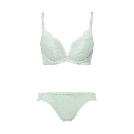 前中心が低く、脇の高いパターンとバストを前中心に集める底厚のモールドカップできれいな谷間を作ります。
