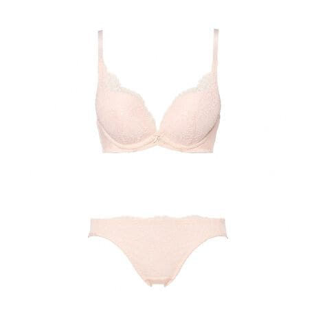 前中心が低く、脇の高いパターンとバストを前中心に集める底厚のモールドカップできれいな谷間を作ります。