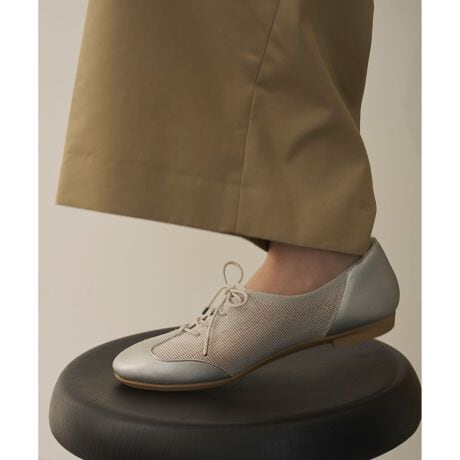 クラシックなダービーシューズをニットで軽やかに仕立てた、トレンド感ある一足です。人工皮革と薄くてしなやかなシースルーニットの組み合わせで、レースアップで甲に合わせやすく、柔らかい素材なので長時間の着用でも疲れにくい快適設計。上品なラウンドトゥとゆったりめのつま先、深めの履き口でフィット感も抜群。