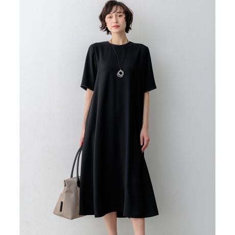 裾にかけてエレガントに広がるシルエットが魅力のシンプルな五分袖ワンピース。ボディラインを拾わないリラクシーなシルエットながら、クルーネックの襟ぐりや肩回り、肘あたりまである袖感でコンパクトに設定することで、すっきりときちんと見えするデザインです。肌離れの良い素材感で、一枚での着用はもちろん、ジャケットを羽織ればオフィスや学校行事などのフォーマルなシーンにも対応。合わせる小物次第で、デイリーからお仕事まで幅広いシーンで活躍します。春先から秋口まで長いシーズン着回せる汎用性の高さも魅力です。カラーは、カラーは、抜け感のあるダークブラウン(#035)、シックで洗練された印象のブラック(#005)、知的で上品なネイビー(#075)の3色展開です。