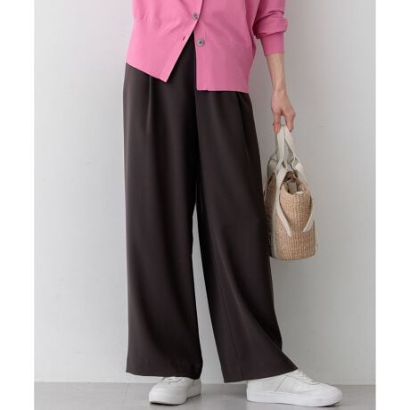 人気のドロストパンツをベースに、筒幅を少し太くして今っぽいシルエットにアップデートしたタック入りワイドパンツです。ウエストの前部分はフラットなベルトデザインにすることでお腹周りをすっきりと見せ、トップスをインしても様になるきちんと感を演出しました。後ろ部分はゴムギャザー仕様のため、締め付け感が少なくストレスフリーな穿き心地です。ヒップ周りのラインも気になりにくく、リラックスして着用いただけます。同素材のトップスと合わせたセットアップスタイルはもちろん、単品使いでもコーディネートの主役になる新しいシルエットの一本です。カラーは、万能なブラック(#005)、肌なじみの良い華やかなピーチ(#012)、上品で着回しやすいベージュ(#033)、シックな大人のダークブラウン(#035)、爽やかなライトブルー(#072)、知的な印象のネイビー(#075)の豊富な6色展開です。