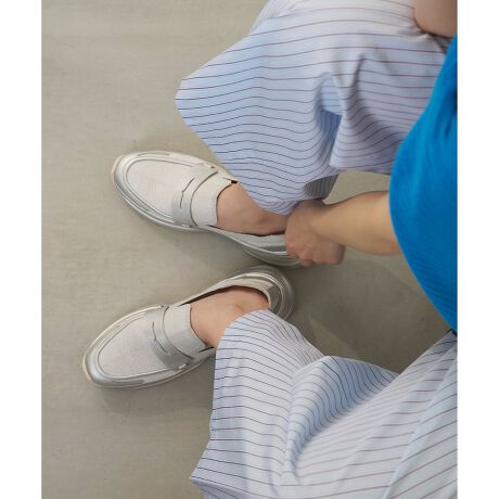 さっと履ける快適なスリップオン仕様で、ニット×人工皮革の異素材コンビが軽やかさとローファーらしい存在感を引き立てます。