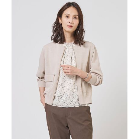 ■デザインリネンとコットンをブレンドした、ナチュラルで上品な風合いが魅力のニットブルゾン。素材本来が持つ清涼感と軽やかさを活かし、春から夏にかけての羽織りとして重宝する1枚に仕上げました。フラップ付きのポケットをあしらい、シンプルながらもメリハリのある表情をプラス。ブラウスやワンピースの上にさらりと羽織るだけで、洗練された大人のカジュアルスタイルが完成します。冷房対策や季節の変わり目にも活躍する、ワードローブにあると頼もしいアイテムです。カラーは、軽やかな印象のアイボリー(#002)、上品で落ち着いた印象のベージュ(#033)、シーンレスに活躍するネイビー(#075)の3色展開です。