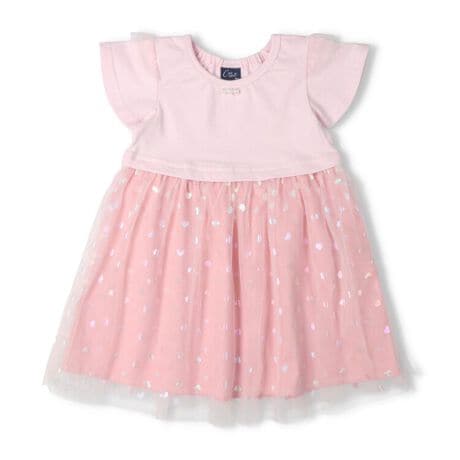ふんわり広がるチュールスカートにキラキラのハートのプリントをした女の子らしい半袖ワンピース。衿ぐりにはパール風のモチーフ付き。見た目も華やかで特別な日やお出かけにも映える1枚。後ろの衿ぐりはゴム仕様で着脱もスムーズに出来ます!【アイテム】トップス シンプル ガーリー フェミニン カジュアル お洒落 オシャレ かわいい 可愛い 普段着 デイリーウェア お出かけ着 お外着 お外遊び着 子ども こども 女児 女の子 ガールズ キッズ ベビーサイズ トドラーサイズ 幼稚園 保育園 小学校 通園 通学 小学生 2026年春夏物新作 丸高衣料 ラベンダー 薄紫色 ピンク クレセント